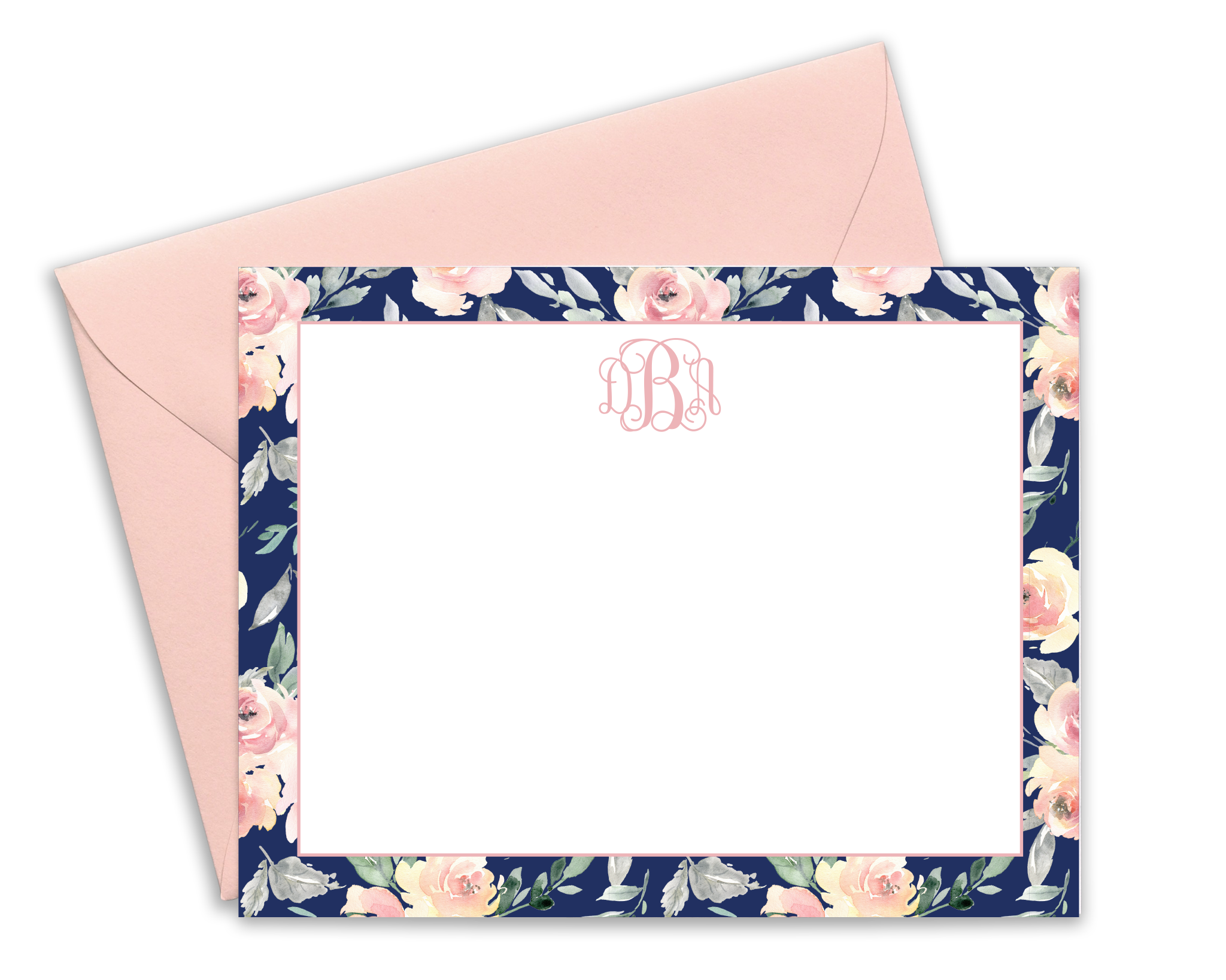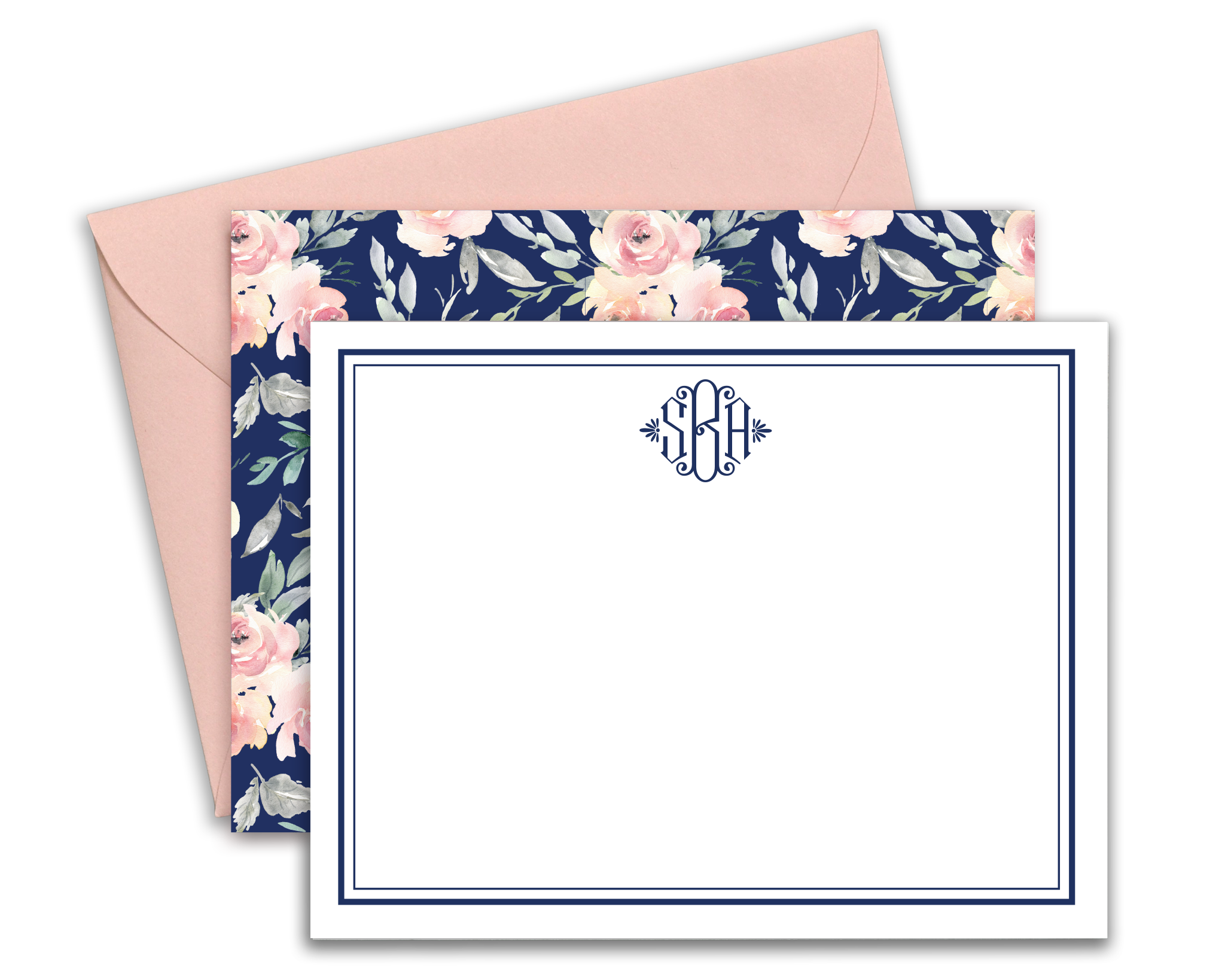 These personalized, navy & blush floral notecards are 4.25" x 5.5" and come with your...